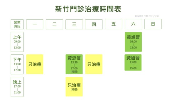 | 11月01日 星期一 | 原黃馗晉院長 門診時段調整為 11:00-15:00,不便之處,敬請見諒。 | 11:00-15:00 |