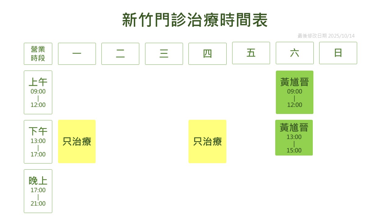 | 12月01日 星期一 | 自12月起,原黃忠信院長隔週三診次不再提供服務,不便之處,敬請見諒。 | |