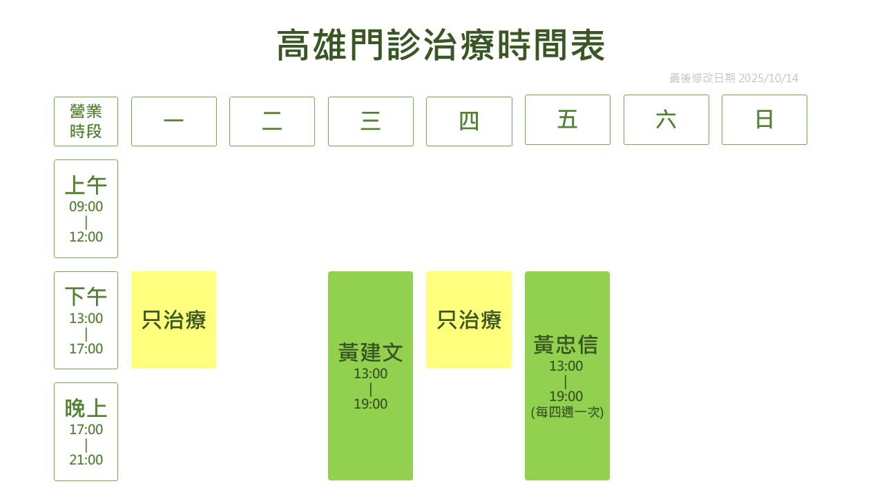 | 11月21日 星期五 | 自11/21起,黃忠信院長高雄診次,每四週一次,不便之處,敬請見諒。 | |