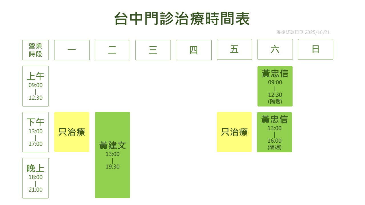 加開 黃忠信院長 居家門診 09:00-15:30。 | |