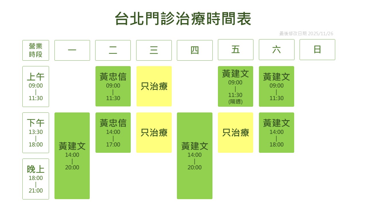 | 12月25日 星期四 | 因行憲紀念日,原黃建文醫師午晚診調整為早午診(同週六時段),治療暫停,不便之處,敬請見諒。 | |
